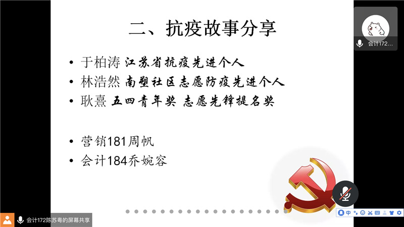 本次公开课分为三个环节。首先,组织学员们观看《讲抗疫故事,做奋进青年》、《致敬抗疫青年》、《抗疫人民战争中的志愿者及其志愿精神》、《青年的战疫担当》、《抗“疫”战线上的青年力量》等感人视频。随后,91直播 商学院、商学院抗疫先进个人于柏涛、林浩然、耿熹三位同学分享了自己的抗疫志愿故事,重点介绍了自己在做志愿者过程中的个人成长和感悟,并鼓励同学们积极参与志愿活动,为我们的祖国贡献一份力量。此外,周帆、乔婉容两位学生党员分享了搜集到的抗疫典型人物故事,包括钟南山、于景海、周玲亿、吴晨等。最后,所有培训学员给抗疫典型写信,明确自己为人民服务的志向,对抗疫青年表达感谢之情,为他们送上祝福。