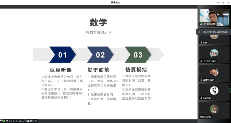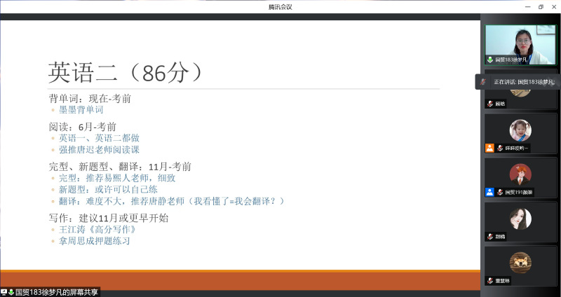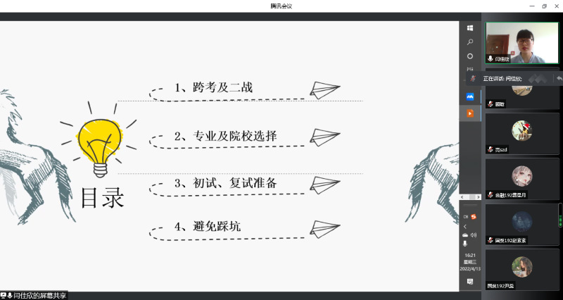 为进一步帮助学生明确考研目标,掌握了解更多考研信息,91直播 于4月7日至15日分别举办了五场线上考研经验分享交流会。交流会由辅导员顾晗老师主持。