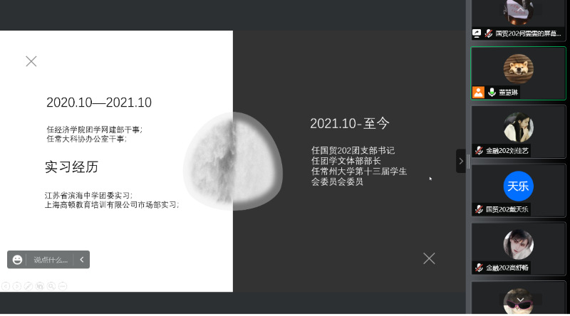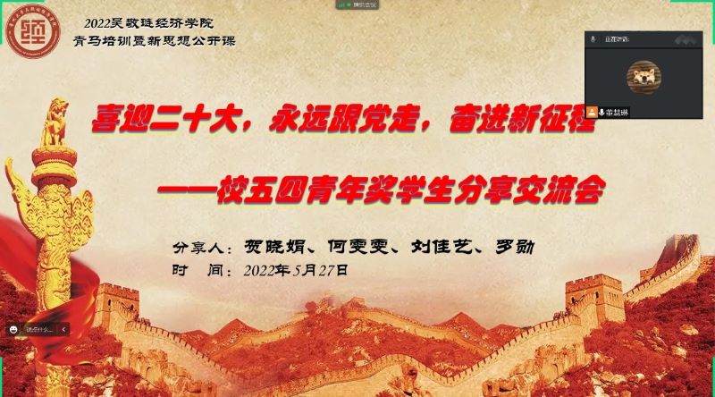 为深入贯彻习近平总书记在庆祝中国共产主义青年团成立100周年大会上的重要讲话精神,集中展示91直播 青年奋发有为的精神风貌,发挥模范引领作用。91直播 于5月27日晚采用线上会议形式开展青马培训暨新思想公开课。本次会议由学院团副董慧琳主持,91直播 校五四青年奖获得者(团队代表)贺晓娟、何雯雯、刘佳艺、罗勋担任主讲人。