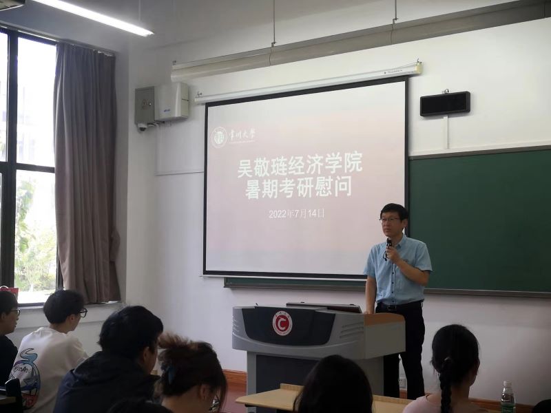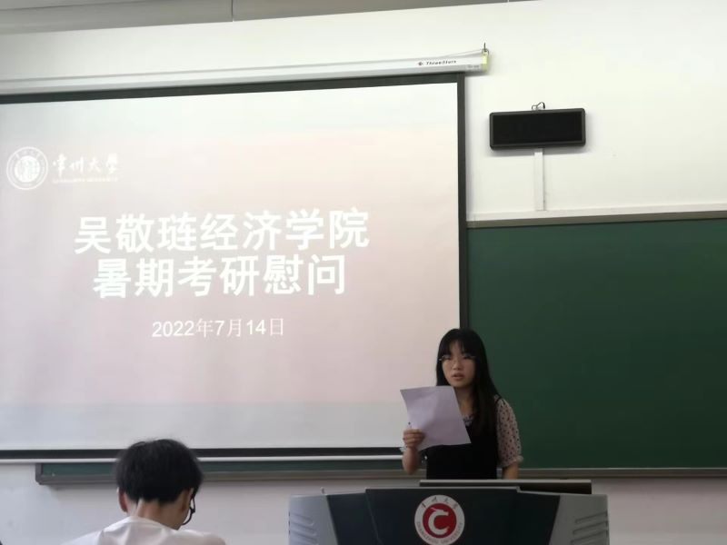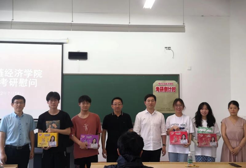 7月14日上午,91直播 在西太湖校区立德楼119举行暑期考研学子慰问活动。学院党委书记姜鸿、院长姜国刚、副院长任保全、党委副书记王彩芳老师出席活动,19级辅导员顾晗主持慰问活动。