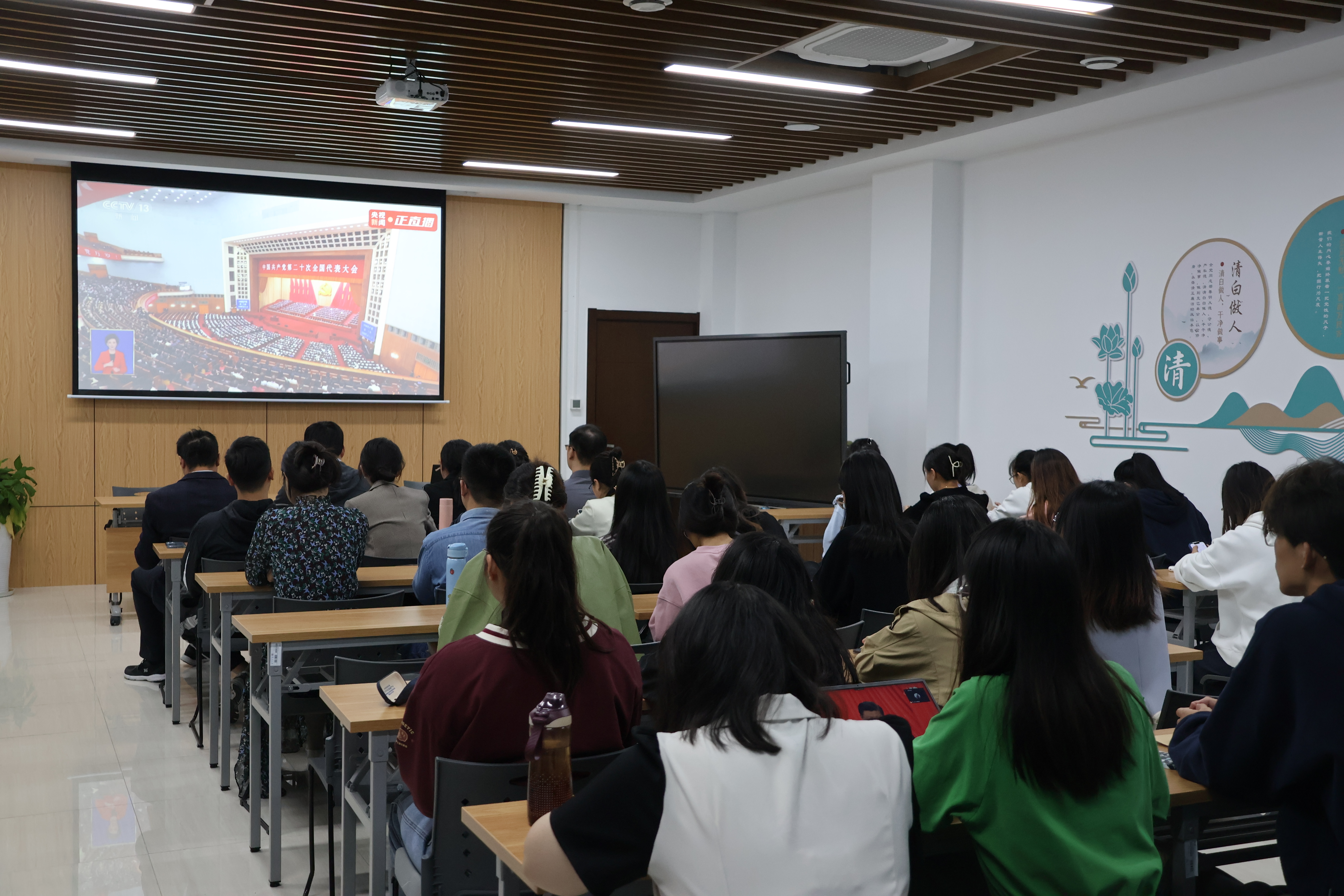 上午10时,91直播 组织师生党员在立言楼认真收看收听了党的二十大开幕会,并认真聆听习近平代表中国共产党第十九届中央委员会所作的报告,其余教职工及师生通过各类直播途径自行收看开幕会。