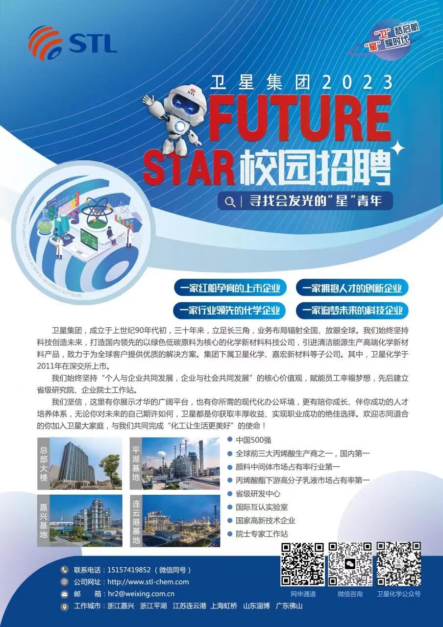 卫星集团成立于1992年,2011年上市,现已成为国内首家拥有超百万吨丙烯、超百万吨丙烯酸及酯完整C3产业链的上市企业,是目前国内最大丙烯酸及酯、高分子乳液以及高吸水功能性材料的生产企业。随着连云港基地超百万吨乙烯项目的推进,将实现C2、C3双产业链发展,为市值、产值破双千亿的目标而砥砺前行。