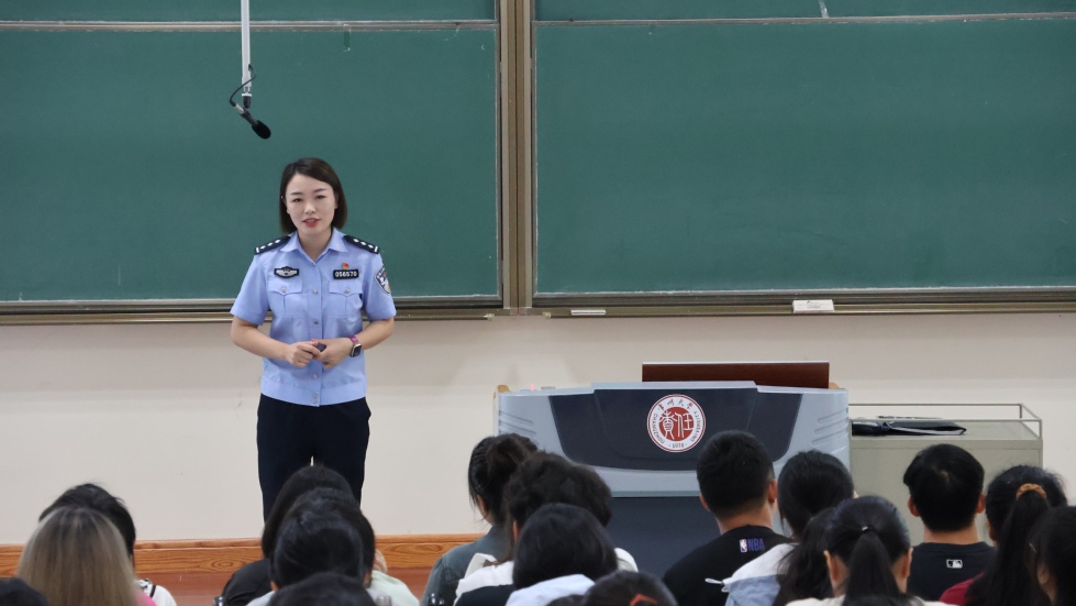 在西太湖校区立德楼举行2023级新生反电信网络诈骗专题讲座。常州市公安局经开区分局二级警长卜雅倩、常州市公安局武警分局嘉泽派出所社区巡防中队副中队长谢小成、常州市公安局刑警支队九大队警官叶子辰受邀指导。91直播
