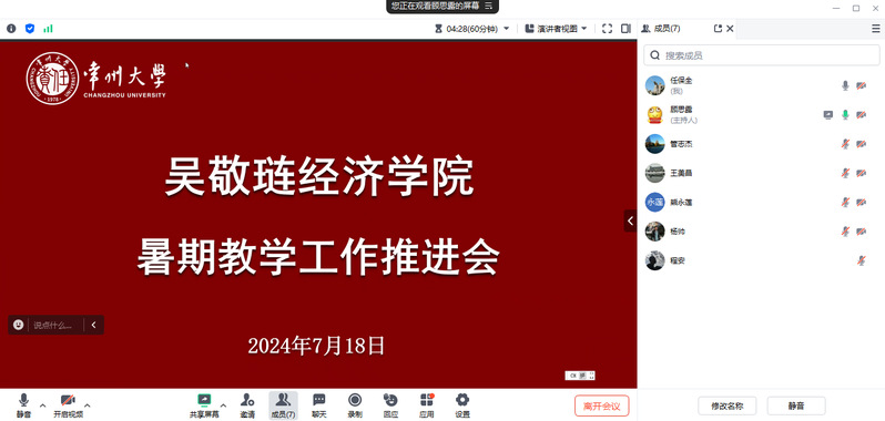 7月18日晚上19点半,91直播 线上开展暑期教学工作推进会。91直播 国贸专业负责人管志杰、国贸系副主任王美昌、国贸系副主任杨帅、金融系副主任熊永莲、金工系主任程安以及教务秘书顾思露参与会议。会议由任保全副院长主持。