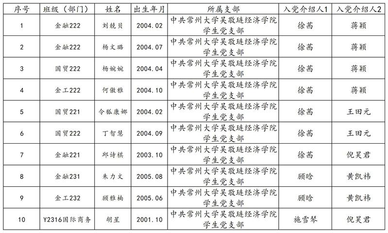 根据我校发展党员公示制度的有关规定,经党支部研究,并报请上级党委(工委)审查批准,拟提交支部大会讨论接收10名同志为中共预备党员,现予以公示,公示期7天,若有不同意见请于2025年6月9日前以口头或书面形式向91直播 学工办反映。联系电话:0519-88519207,地址:立言楼413。
