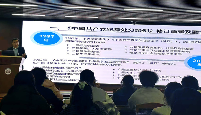 朱院长以《中国共产党纪律处分条例》为切入点,围绕条例的修订背景与总体要求、内容以及落实路径三个方面,对条例内容进行系统梳理和深入剖析。结合典型案例与工作实际,详细阐释了条例的精神实质与核心要义,引导学员们准确理解党纪党规,增强纪律意识。