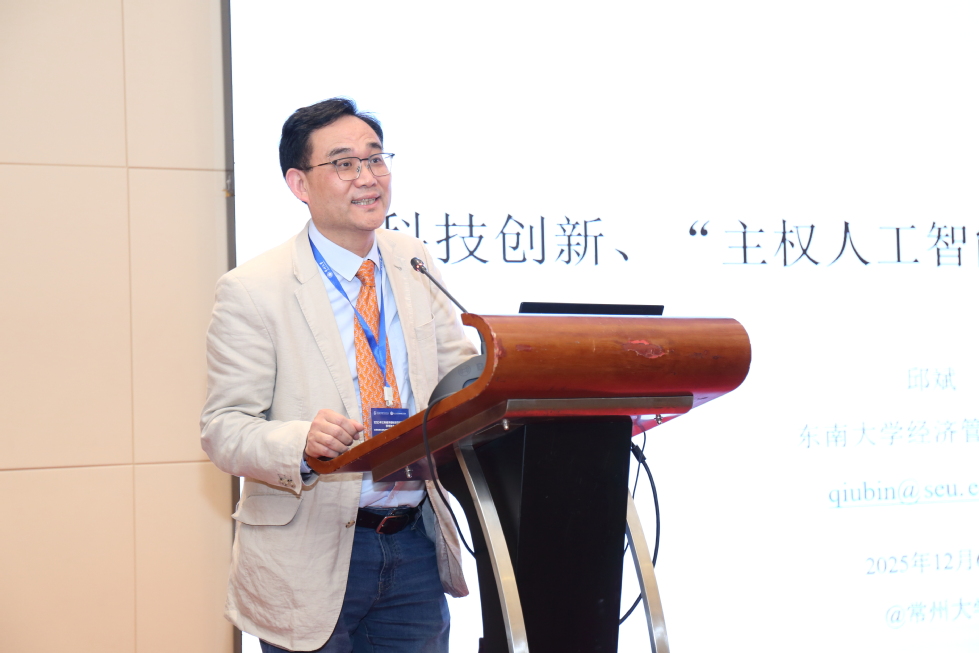 (图为东南大学国际经济研究所邱斌教授作主题报告)