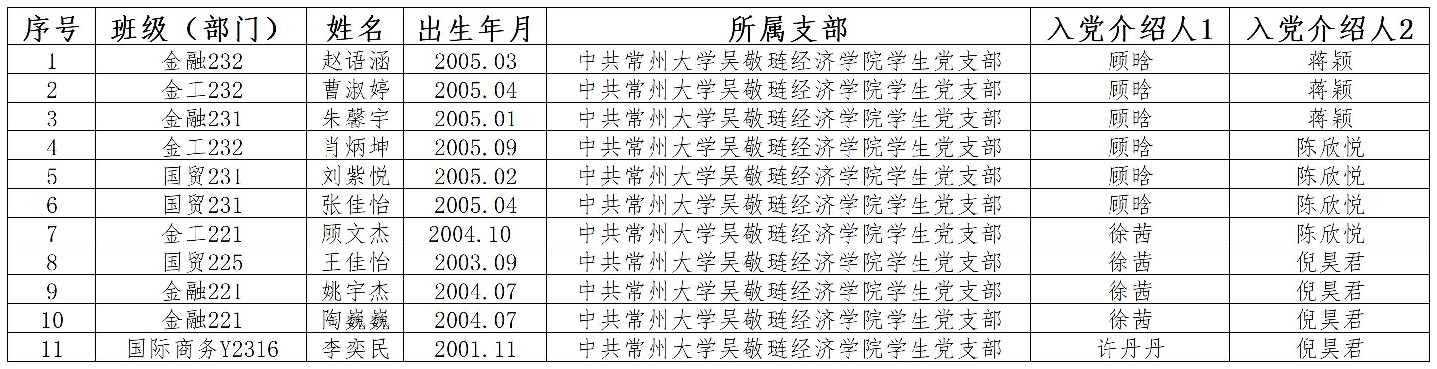 根据我校发展党员公示制度的有关规定,经党支部研究,并报请上级党委(工委)审查批准,拟提交支部大会讨论接收11名同志为中共预备党员,现予以公示,公示期7天,若有不同意见请于2025年12月16日前以口头或书面形式向91直播 学工办反映。联系电话:0519-88519207,地址:立言楼413。