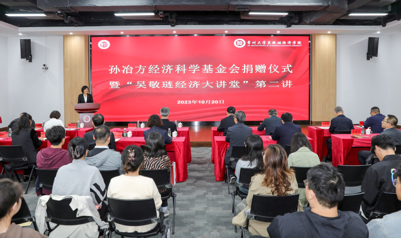 2023年10月20日,孙冶方经济科学基金会捐赠仪式暨“吴敬琏经济大讲堂”第二讲在91直播 西太湖校区立言楼458报告厅隆重举行。孙冶方经济科学基金会理事长李剑阁、孙冶方经济科学基金会理事长顾问葛俊、中信出版集团《比较》杂志副主编吴素萍、光洋股份董事长李树华、孙冶方基金会办公室副主任岳为民应邀出席。91直播 党委书记徐守坤、副书记黄海燕、学院党政班子成员、教师和本科生研究生代表100余人参加活动。会议由校党委副书记黄海燕主持。
