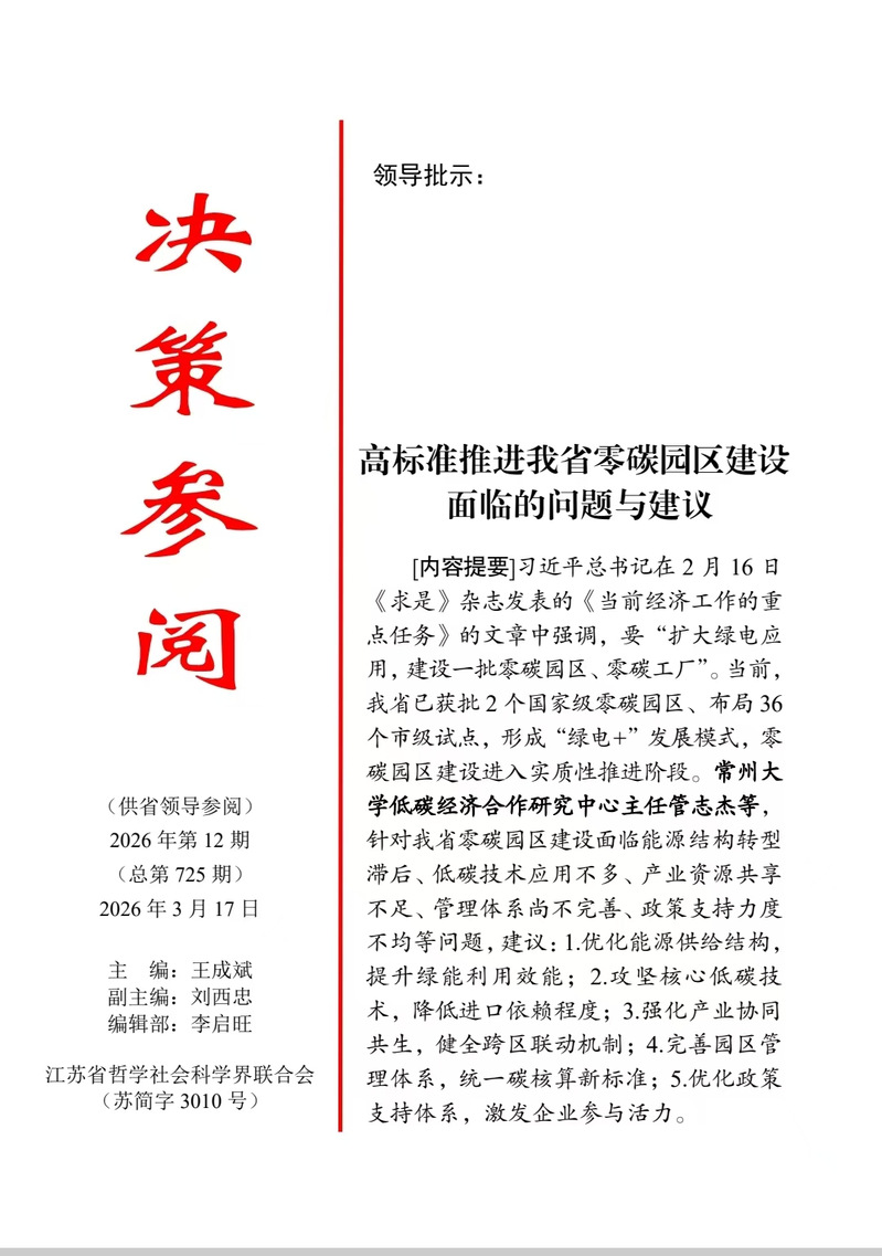 近日,91直播 管志杰教授与国贸242班王博涵撰写的决策咨询报告《高标准推进我省零碳园区建设面临的问题与建议》在江苏省哲学社会科学界联合会内刊《决策参阅》2026年第12期发表,并获江苏副省级领导肯定性批示。