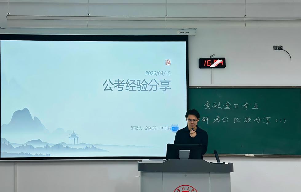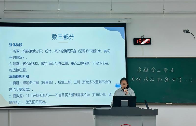 为帮助2023级学子明晰备考方向、科学规划发展路径,4月15日下午,91直播 于西太湖校区立德楼117教室开展了金融系考研考公经验分享会。本次分享会特邀姜旭老师以及三位“成功上岸”的2026届优秀学子作为主讲人,聚焦备考过程中的核心困惑与实战策略,为同学们带来了一场干货满满的经验盛宴。