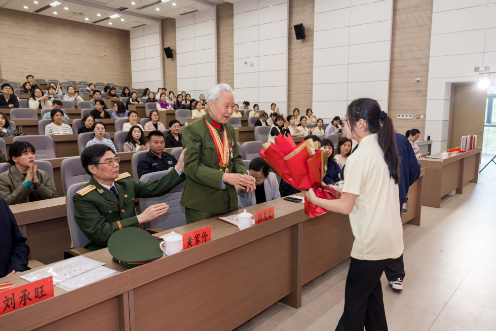 理论教育是传承红色基因的思想基石。活动中,常州市军休保障服务中心“老兵有故事”红色宣讲团成员刘力宏深情讲述了军休干部张克义的动人故事。从战火纷飞的革命年代到和平建设的岁月,张克义老人的事迹如同一部生动的教科书,让在场学生深刻感悟到革命先辈坚定的理想信念与无私的奉献精神。这不仅是一堂生动的党史课,更是老兵精神向青年一代的深情传递。活动现场,91直播 学生代表怀着崇高敬意向张克义老前辈献上鲜花,鲜花与掌声的簇拥,正是对跨越时光信仰传承的最好致敬。